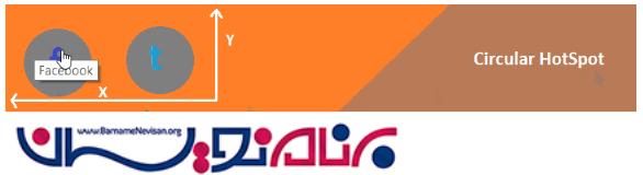 کد بالا را برای ایجاد hotspots دایره ای نوشته ایم. در این کد ما دو CircleHotSpots را قرار داده ایم که اولی برای facebook و دومی برای twitter می باشد بنابراین اگر ما موس را روی ناحیه hotspot حرکت دهیم، نام ناحیه را در tooltip نشان می دهد.