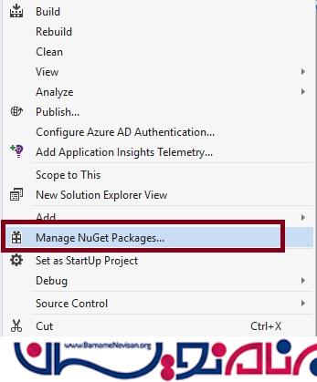 بر روی نام پروژه راست کلیک کرده و گزینه NuGet Pakage manager را انتخاب میکنیم.