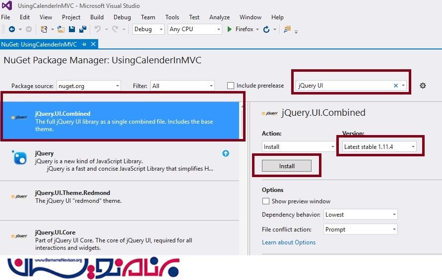 ورژن مناسب را انتخاب کرده و نصب میکنیم. با این کار کتابخانه jQuery UI به پروژه اضافه شد و فایل اسکریپت آن در پوشه Script قرار گرفت.
