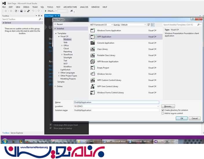 بعد از این توضیحات کار عملی خود را شروع می کنیم .یک پروژه از نوع wpf باز کنید برای این کار مسیر File=>Project=>windows=>WPF را دنبال کنید