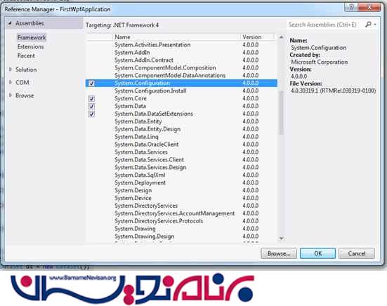 را به برنامه اضافه کنید .بعد از این کار باید رشته اتصای خود را تنظیم نمایید .برای این کار در داخل APP.CONFIG ابتدا رفرنس System.Configuration.dll را اضافه می کنیم .بر روی نام پروژه و یا بر روی پوشه Reference کلیک راست کرده و گزینه Add Reference را بزنید