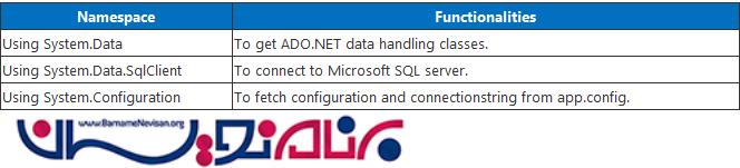 قبل از شروع کد نویسی نیاز دارید تا فضاهای نام مورد نیاز را به پروژه اضافه کنید .برای اینکه دیتاگرید DataGrid خود را از اطلاعات درون دیتابیس پر کنیم نیاز داریم تا فضاهای نام
