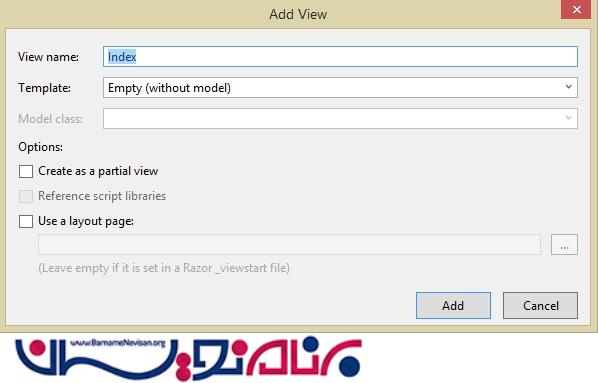 مرحله بعدی قرار دادن یک View برای عمل index است . با راست کلیک بر روی View و انتخاب گزینه Add View آن را ایجاد کنید. این View از Layout Page یا Template دیگری استفاده نمیکند.