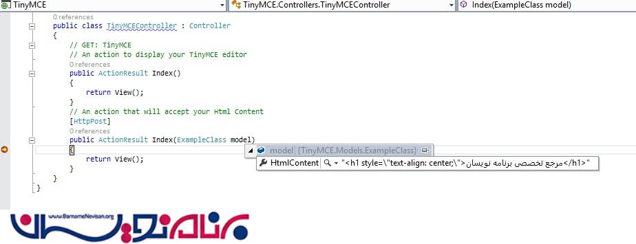 برای استفاده از این ویرایشگر نیاز به یک کنترلر همراه Action نیاز دارید که به یک View اشاره میکند. کنترلری با نام TinyMCE ایجاد کنید. این کنترلر یک Action برای فراخوانی index دارد و یک Action که صفت [HttpPost] به آن داده شده است.