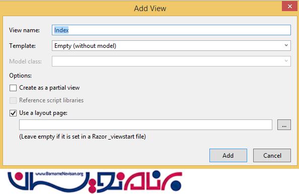 بر روی اکشن index کلیک راست کرده و AddView را می زنیم یک View خالی بدون مدل ایجاد می کنیم .