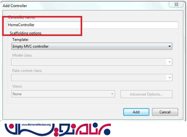 یک کنترلر جدید به نام Home ایجاد میکنیم .