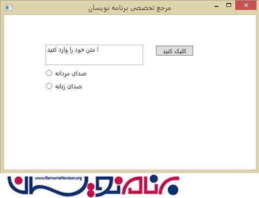 اکنون بر نامه را اجرا کنید و درون textbox متنی را قرار دهید. یکی از صدا ها را انتخاب کرده و دکمه را کلیک کنید.