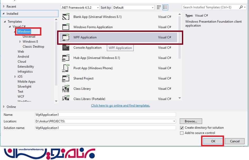 برای شروع در ویژوال استودیو از قسمت New Project گزینه WPF Application را انتخاب میکنیم.