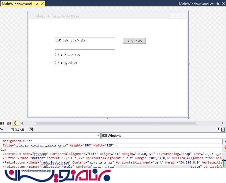 از قسمت Toolbox یک textbox ، یک button و دو radiobuttons به پنجره اضافه میکنیم و به صورت زیر آن را طراحی میکنیم.