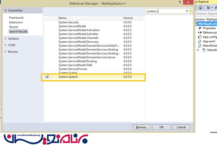 بر روی پروژه راست کلیک کرده و منبع System.speech را به آن اضافه میکنیم.