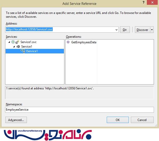 بر روی وب سایت ایجاد شده راست کلیک کرده و Add Service Reference را انتخاب میکنیم. سرویس مورد نظر را انتخاب کرده و وب سایت اضافه میکنیم.