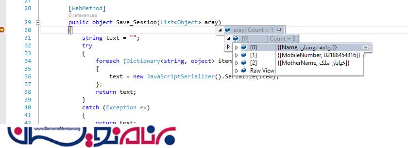 در اینجا یک WebMethod ایجاد کرده ایم که لیستی از آبجکت ها را به عنوان پارامتر استفاده می کند، در این لیست داده ها با فراخوانی Ajax به عنوان پارامتر ارسال می شوند.