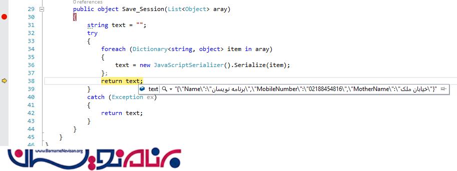 حالا داده ها را پر کرده و بر روی دکمه ارسال کلیک می کنیم. یک breakpoint در WebMethod قرار می دهیم و بررسی می کنیم که چه داده ای به وب سرویس آمده است: