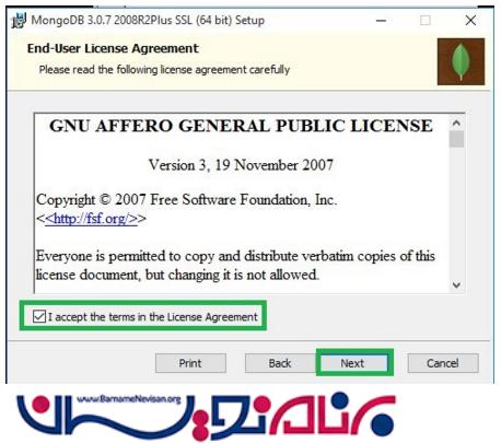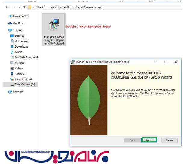 بر روی MongoDb Setup دو بار کلیک کرده و بعد در ویزارد setup روی گزینه Next کلیک کنید.