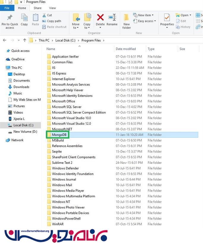 حالا بعد از نصب موفقیت آمیز MongoDB فولدری را خواهید دید که با اسم MondoDB در دایرکتوری شما ایجاد شده است. شما می توانید این پوشه را در آدرس زیر پیدا کنید: C:\Program Files