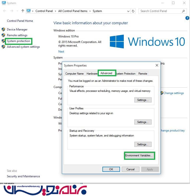 حالا به System Properties رفته و دکمه Environment Variables را بزنید تا مراحل نصب را در سیستم شما بررسی و تصحیح شود.