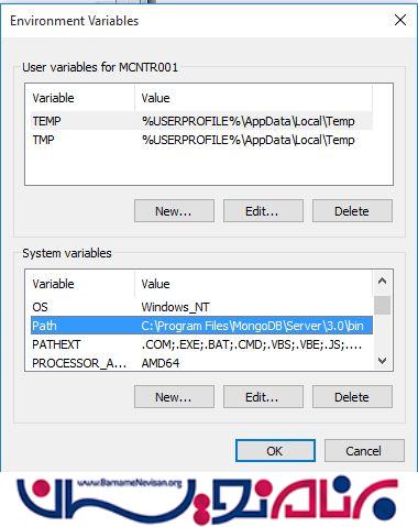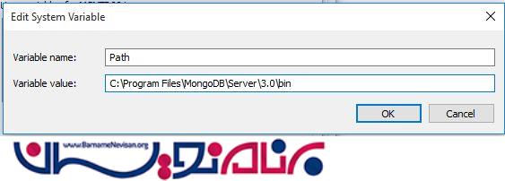 بر روی Environment variables کلیک کنید سپس پنجره زیر باز خواهد شد. حالا بر روی mongodb path دوبار کلیک کنید تا مسیر صحیح برای مواردی که اشتباه شده باشد ایجاد شود:
