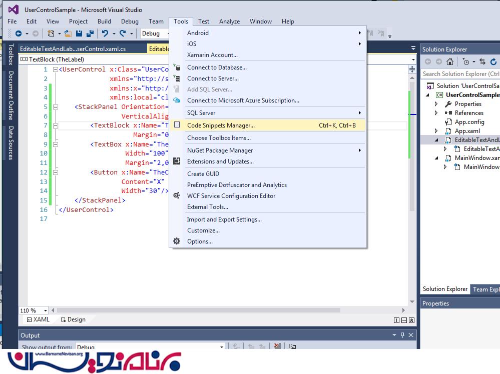 Snippets Manager را با رفتن به منوی Tools در Visual Studio باز کرده و بر روی بخش Code Snippets Manager کلیک کنید: