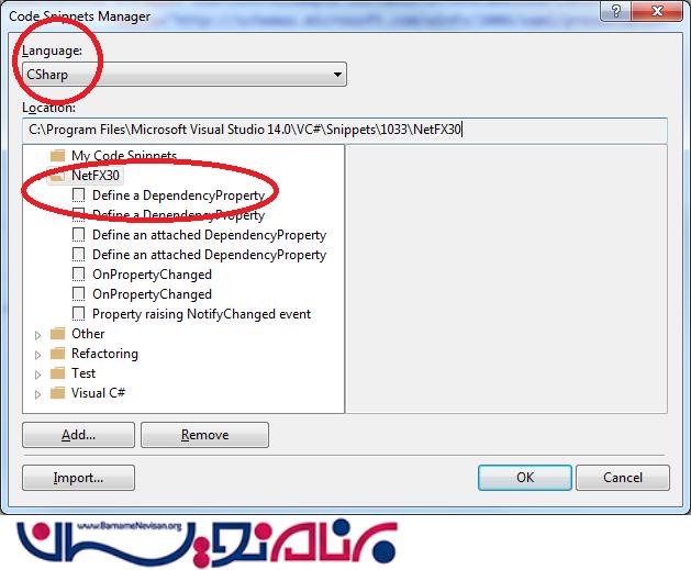 در Snippets Manager زبان را به C# تغییر دهید (با استفاده از drop down در بالا) و بر روی فولدر NetFX30 کلیک کنید: