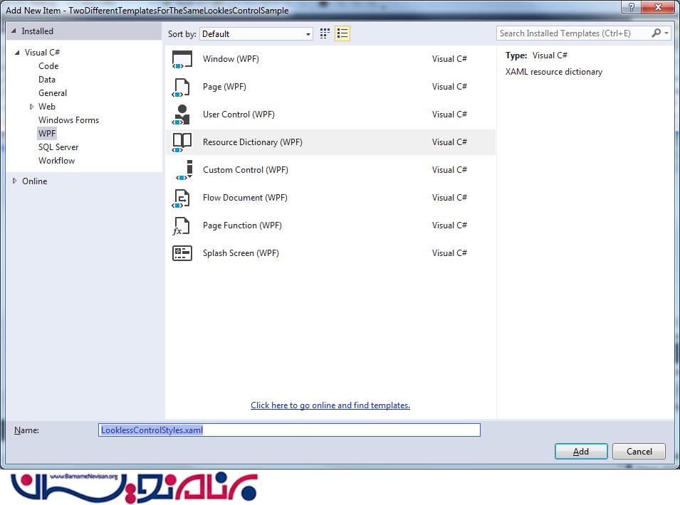پوشه WPF را در سمت چپ و Resource Dictionary (WPF) را در سمت راست انتخاب کنید: