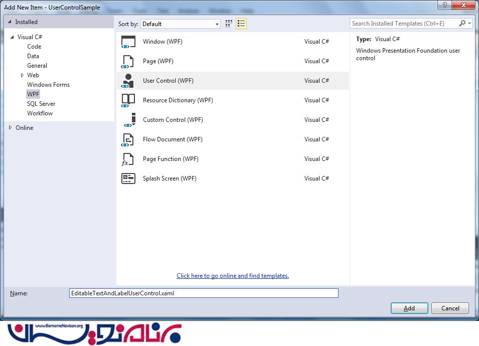 به منظور ایجاد یک WPF UserControl در Visual Studio روی پروژه در Solution Explorer راست کلیک کرده و Add->New Item را انتخاب کنید سپس WPF را از قسمت سمت چپ انتخاب کرده و User Control (WPF) را از روی سمت راست انتخاب کنید و نام کنترل را وارد کنید: