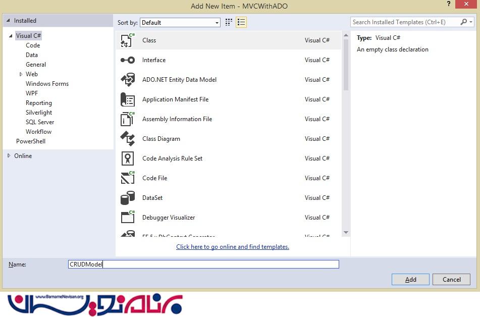 دسترسی به بانک از طریق پوشه Models انجام خواهد شد. Model یک فایل کلاس است . بر روی مدل راست کلیک کرده و کلاسی با نام CRUDModel ایجاد میکنیم.