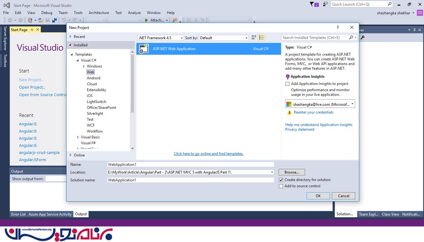 برنامه Visual Studio را باز کرده و از مسیر File > New > Project یک پنجره جدیدی باز می شود که باید بر روی ASP.Net Web Application کلیک کرده و گزینه OK را انتخاب کنید.