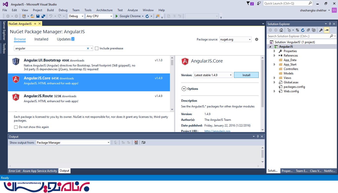 برای انجام آن بر روی نام پروژه کلیک کرده و Manage NuGet Packages را انتخاب کنید سپس در پنجره بعدی کلمه Angular را جستجو کرده و نسخه آپدیت شده AngularJS.Core را نصب کنید.