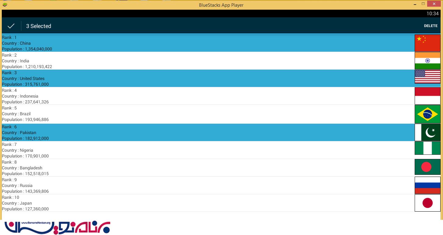 در این نمونه کاربر با کلیک کردن به مدت چند ثانیه با انتخاب آیتم مورد نظر می تواند اطلاعات آن ردیف لیست ویو را حذف نماید که ممکن است شامل عکس و یا متن بوده باشد.