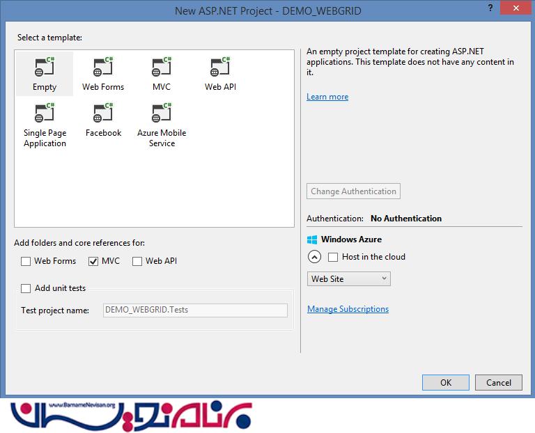 برای انجام این کار به صورت عملی ابتدا یک پروژه MVC از نوع Empty ایجاد کنید .نام این پروژه را DEMO_WEBGRID بگذارید.