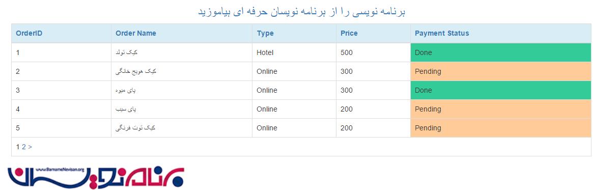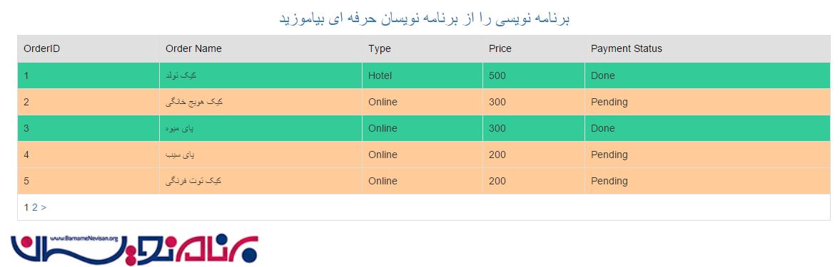 برای انجام این کار توسط کدهای بالا سطر مورد نظر را پیدا کرده و طبق شرط به آن رنگ را اعمال کرده ایم .البته به همه سطر رنگ نداده ایم بلکه فقط ستون پنجم بر اساس شرایطی رنگی می شوند.برای این کار از Jquery استفاده کرده ایم .