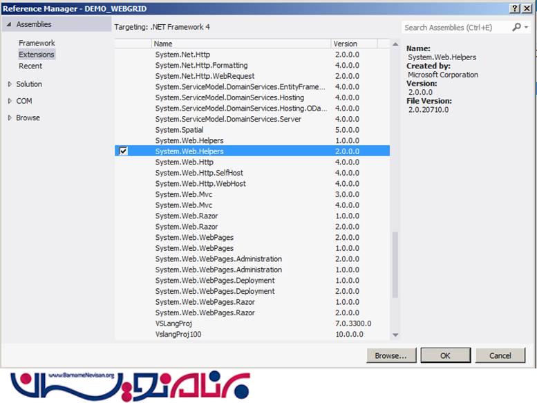 پنجره ای به صورت زیر برای شما باز خواهد شد که در سمت چپ بر روی گزینه Extensions کلیک کنید و در قسمت وسط System.Web.Helpers.dll را پیدا کرده و آن را اضافه کنید