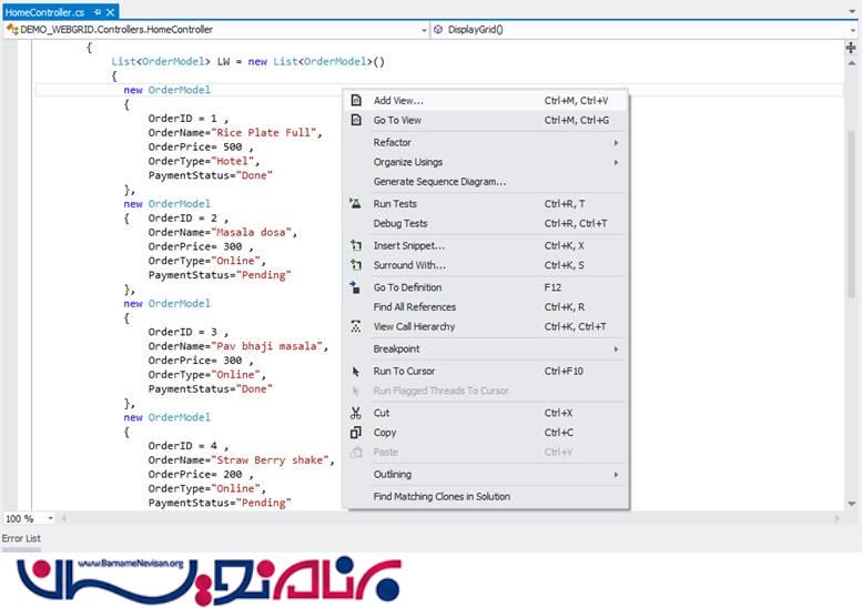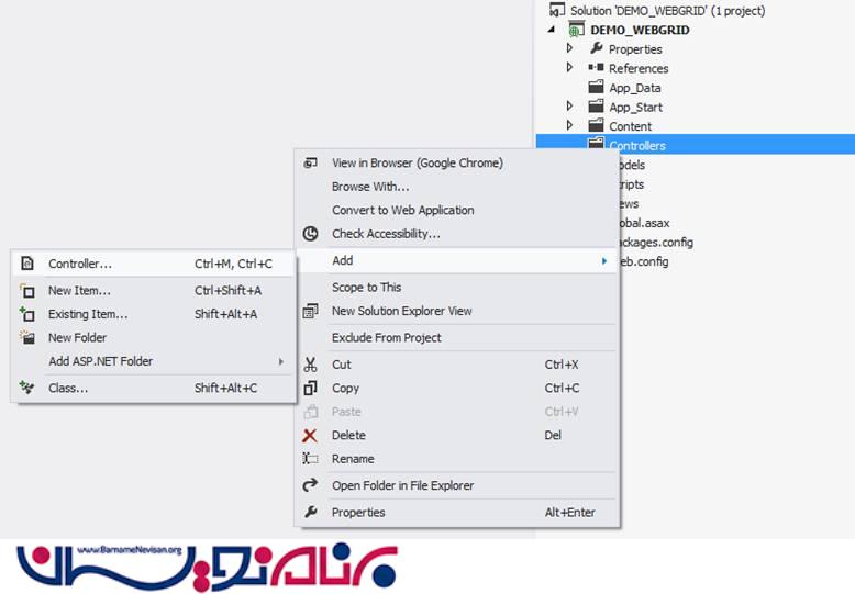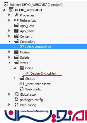 نوع این کنترلر را از نوع Empty در نظر می گیریم .در داخل این کنترلر یک اکشن به نام Index وجود دارد نام این اکشن را به DisplayGrid تغییر می دهیم .در داخل این اکشن لیستی از مدل ایجاد می کنیم و در داخل آن اشیایی از مدل ایجاد کرده و یک به یک به داخل لیست اضافه می کنیم .قصد داریم این لیست را به گرید متصل کنیم تا داده های این لیست را نمایش دهد .البته می توان به جای این لیست گرید را به دیتابیس متصل کرد .
