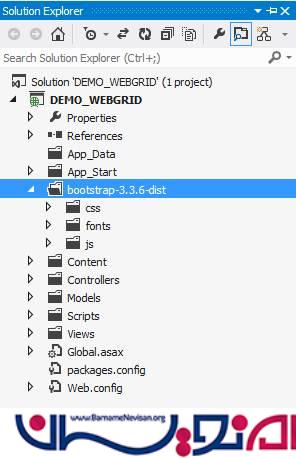 برای این که رنگی شود css و اسکریپت Bootstrap را به برنامه اضافه می کنیم .بعد از افزودن این منابع شکل solution Explorer به صورت زیر خواهد بود .