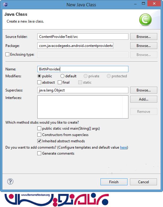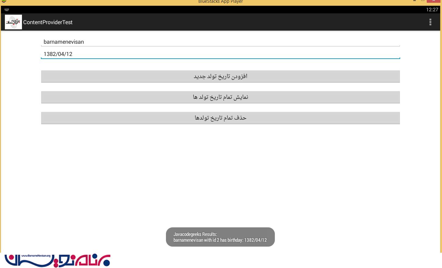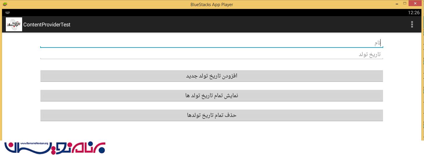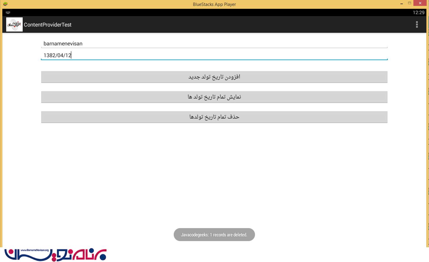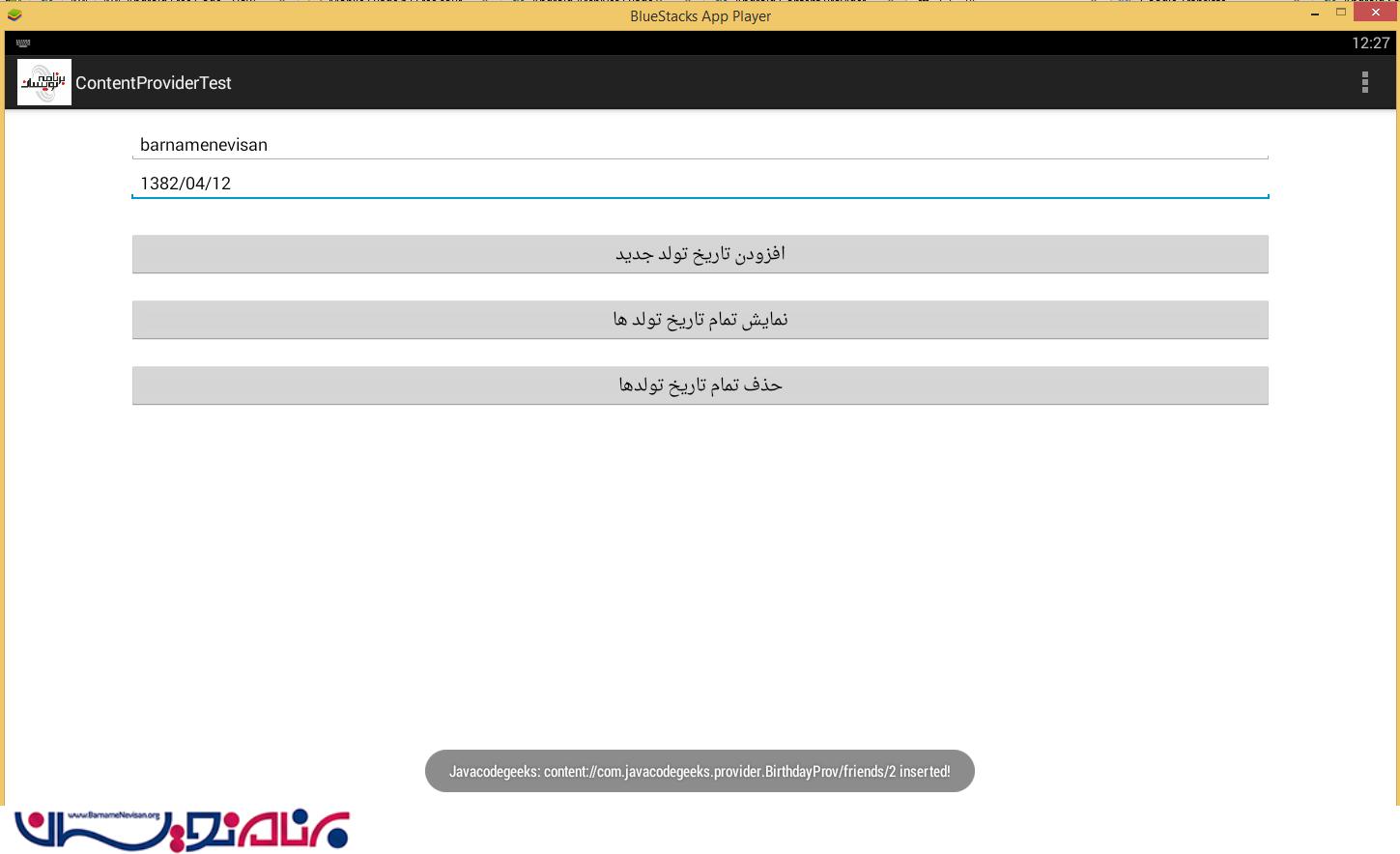هم چنین ما می خواهیم content provider مان با prpperty کار نماید نیاز داریم که تابع های oncreate و query,insert,delete,gettype را ایجاد نماییم.داخل کلاس birthprovider:
