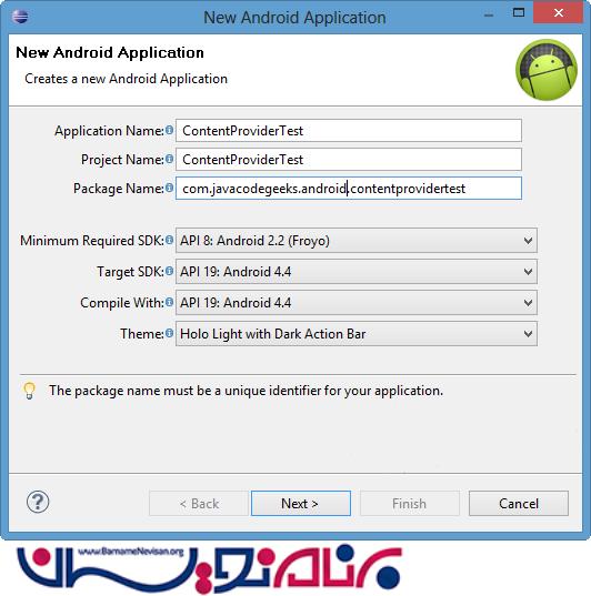 کلاسی که ایجاد می نمایید یک زیر کلاس از کلاس contentprovider است، و باید یک uri را تولید نماییم، که شکل فرمت آن به گونه ی زیر است: