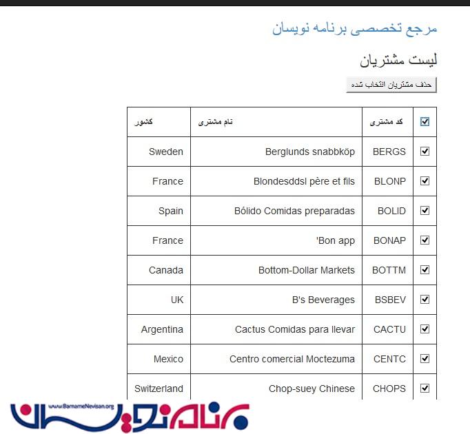 هر ردیف جدول شامل یک checkbox است که کلاس checkbox به آن اختصاص داده شده است. این مقدار برای CustomerID هر ردیف تنظیم شده است.