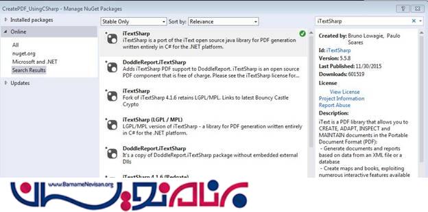 مرحله ی 1 : در ابتدا باید iTextSharp را از طریق NuGet packages نصب کنیم. نحوه ی این کار در شکل زیر آمده است :