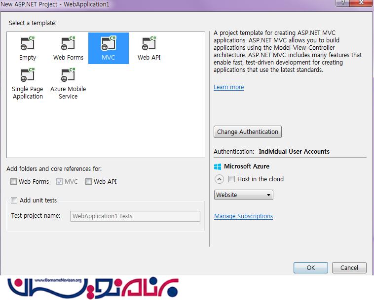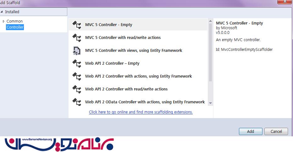بر روی پوشه Controller راست کلیک کرده و Add Controller را انتخاب می کنیم و بر روی MVC 5 Controller – Empty کلیک و Add را انتخاب می کنیم.