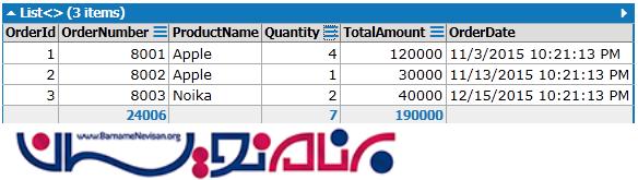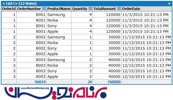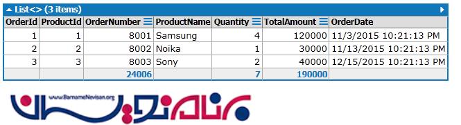 SELECT [t1].[OrderId], [t1].[OrderNumber], [t0].[ProductName], _ [t1].[Quantity], [t1].[TotalAmount], [t1].[OrderDate] FROM [Product] AS [t0], [Orders] AS [t1] ORDER BY [t1].[OrderId]