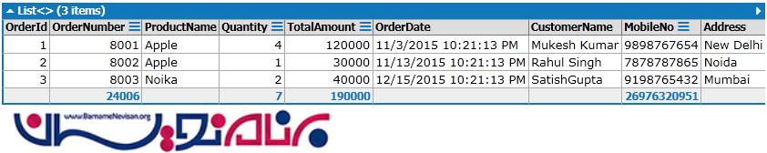 SELECT [t1].[OrderId], [t1].[OrderNumber], [t0].[ProductName], _ [t1].[Quantity], [t1].[TotalAmount], [t1].[OrderDate], _ [t2].[CustomerName], [t2].[MobileNo], [t2].[Address] FROM [Product] AS [t0] INNER JOIN [Orders] AS [t1] ON ([t0].[ProductId]) = [t1].[ProductId] INNER JOIN [Customer] AS [t2] ON [t1].[CustomerId] = ([t2].[CustomerId])