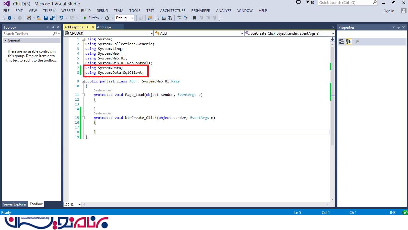 در بالای کدتان ، دو قسمتی که در شکل نشان داده شده است را اضافه کنید. (using System.Data وusing System.Data.SqlClient)