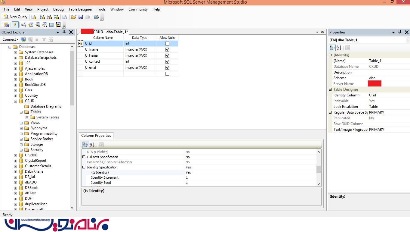 ستون U_id را Auto- Increment کنید. (ستون U_id را انتخاب کنید و به Property ستون بروید و Is Identity=Yes را قرار بدهید. ) Ctrl + S را برای ذخیره کردن فشار دهید. یک پنجره باز می شود که در آن باید نام database خودتان را وارد کنید. نام "tbl_user" را برای آن بنویسید و گزینه ی OK را انتخاب کنید.