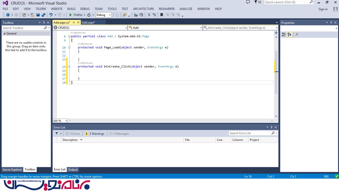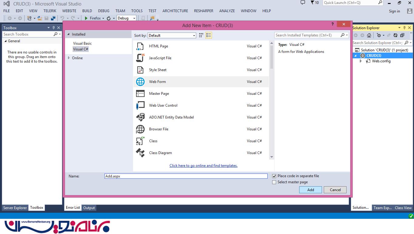 گزینه ی "Web Form" را انتخاب کنید و نام "Add.aspx" را برای آن انتخاب کنید. سپس گزینه ی Add را انتخاب کنید.