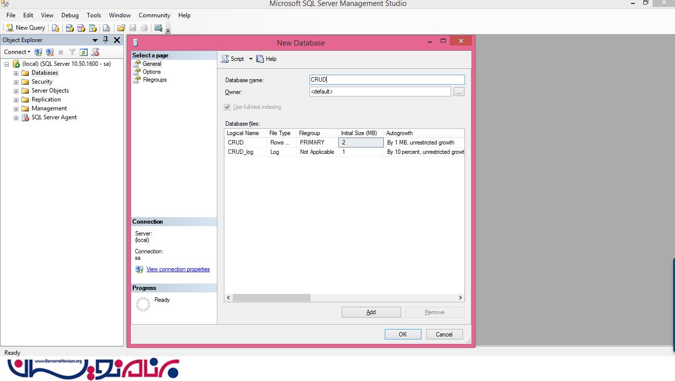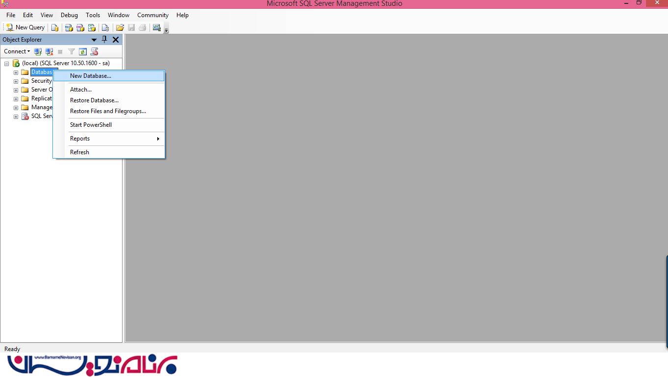یک database جدید ایجاد کنید. (بر روی Database کلیک راست کنید و سپس New Database را انتخاب کنید.)
