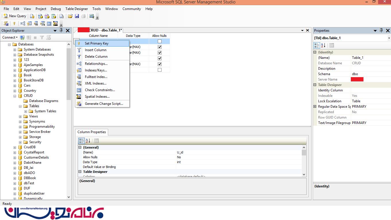 کلید اصلی (Primary Key) جدول را انتخاب کنید. ( بر روی ستون U_id کلیک راست کنید و سپس بر روی گزینه ی Primary Key کلیک کنید. )