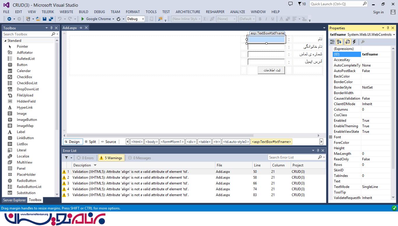 4-یک TextBox اضافه کنید. ( از TextBox ،ToolBox را انتخاب کنید و سپس آن را به سلول سوم از ردیف اول بکشید.)