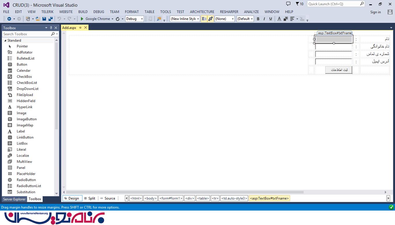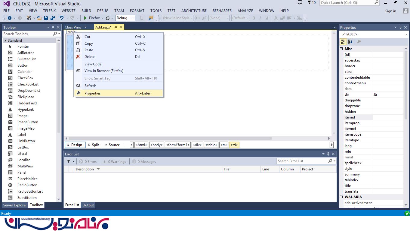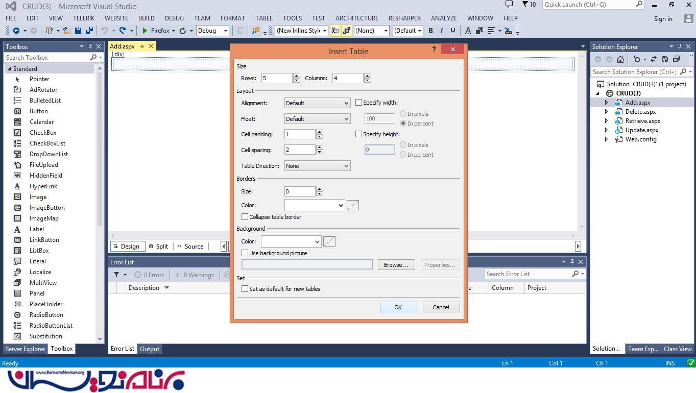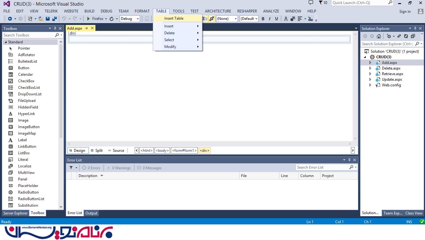 یک جدول HTML به صورت داینامیک ایجاد کنید. ( Add.aspx را باز کنید سپس از منوی بالا ، گزینه ی Table را انتخاب کنید. )