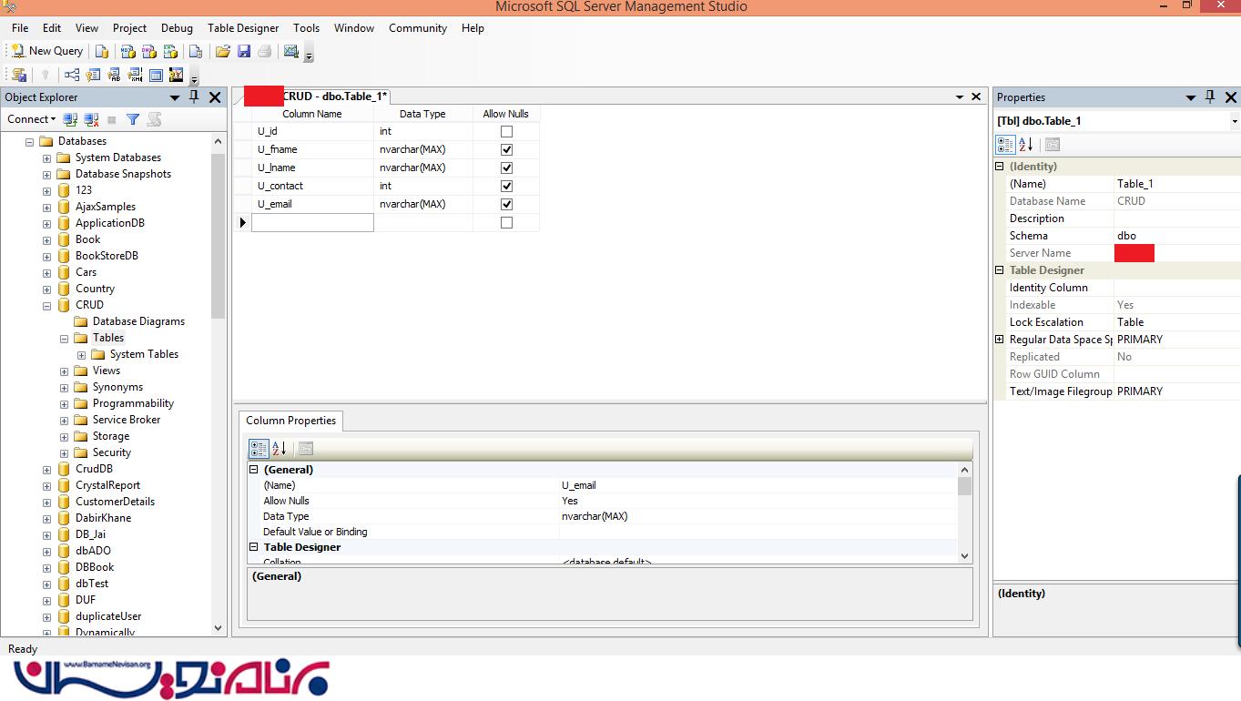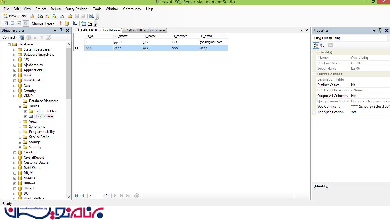 در این مرحله می خواهیم ببینیم اطلاعات با موفقیت ثبت شده اند یا نه . (برنامه SQL Server را باز کنید ، سپس پایگاه داده ی "CRUD" را انتخاب کنید، بر روی tbl_user ، راست کلیک کنید و جدول را باز کنید.) خواهید دید که اطلاعات به درستی در جدول قرار گرفته اند.