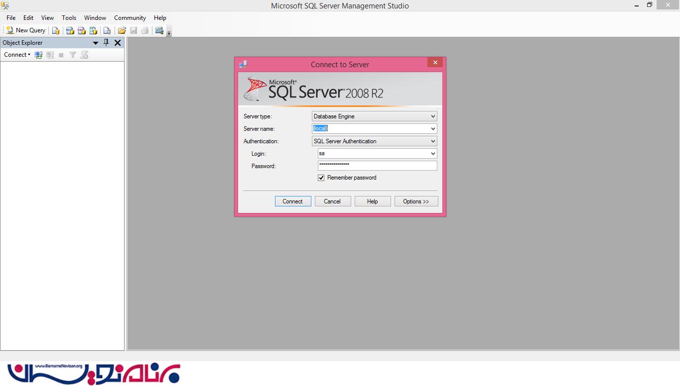 برنامه SQL Server را باز کنید. ( Server Name ،Id ،Password را وارد کنید و سپس بر روی Connect کلیک کنید.)